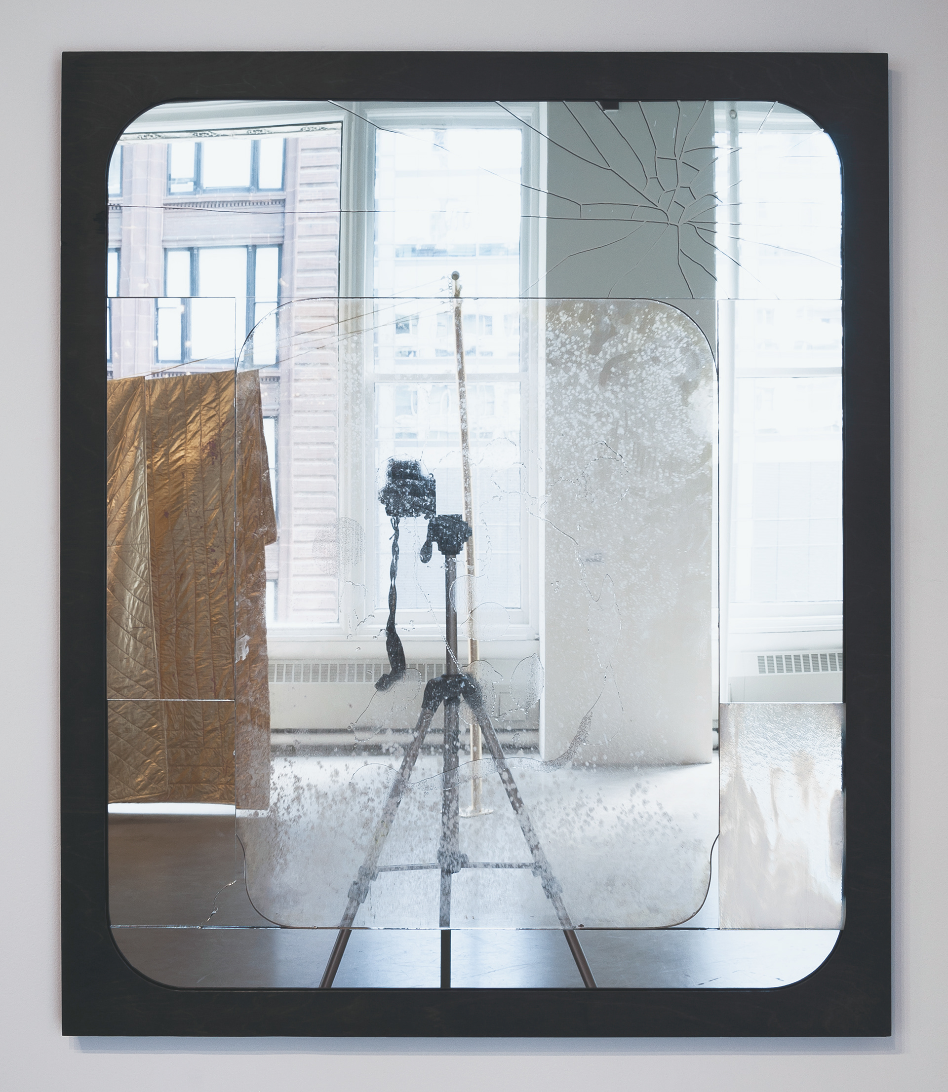 back-carved and found mirrors, cathedral glass, untempered glass panes, epoxy, stained wood